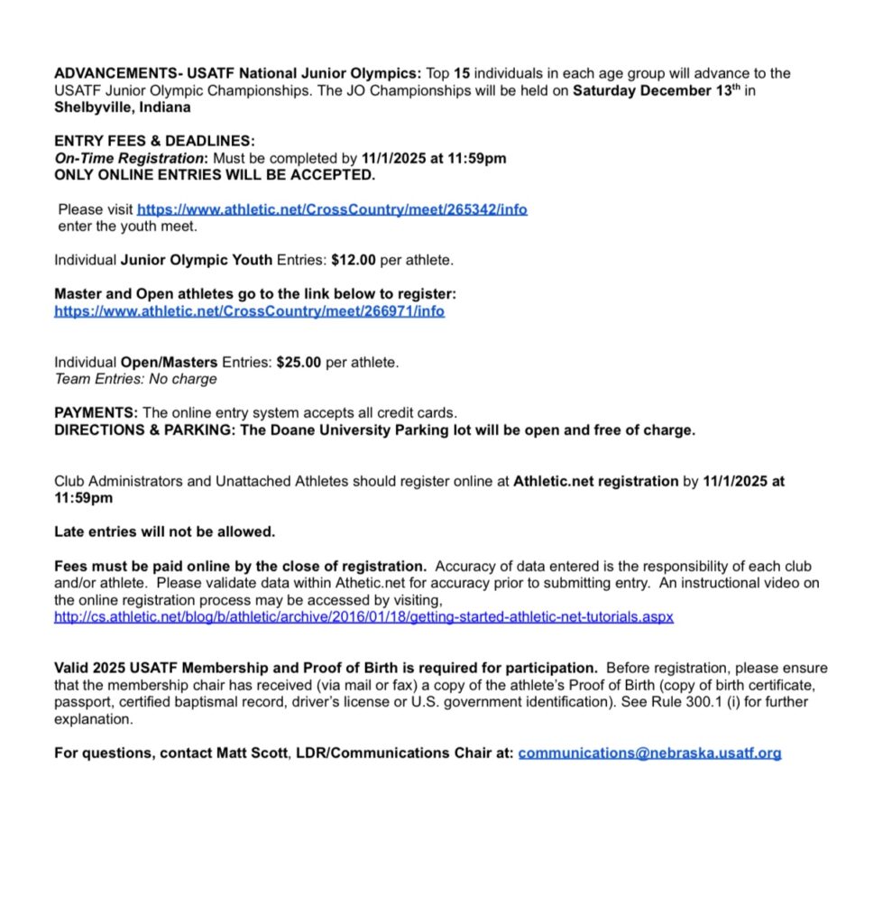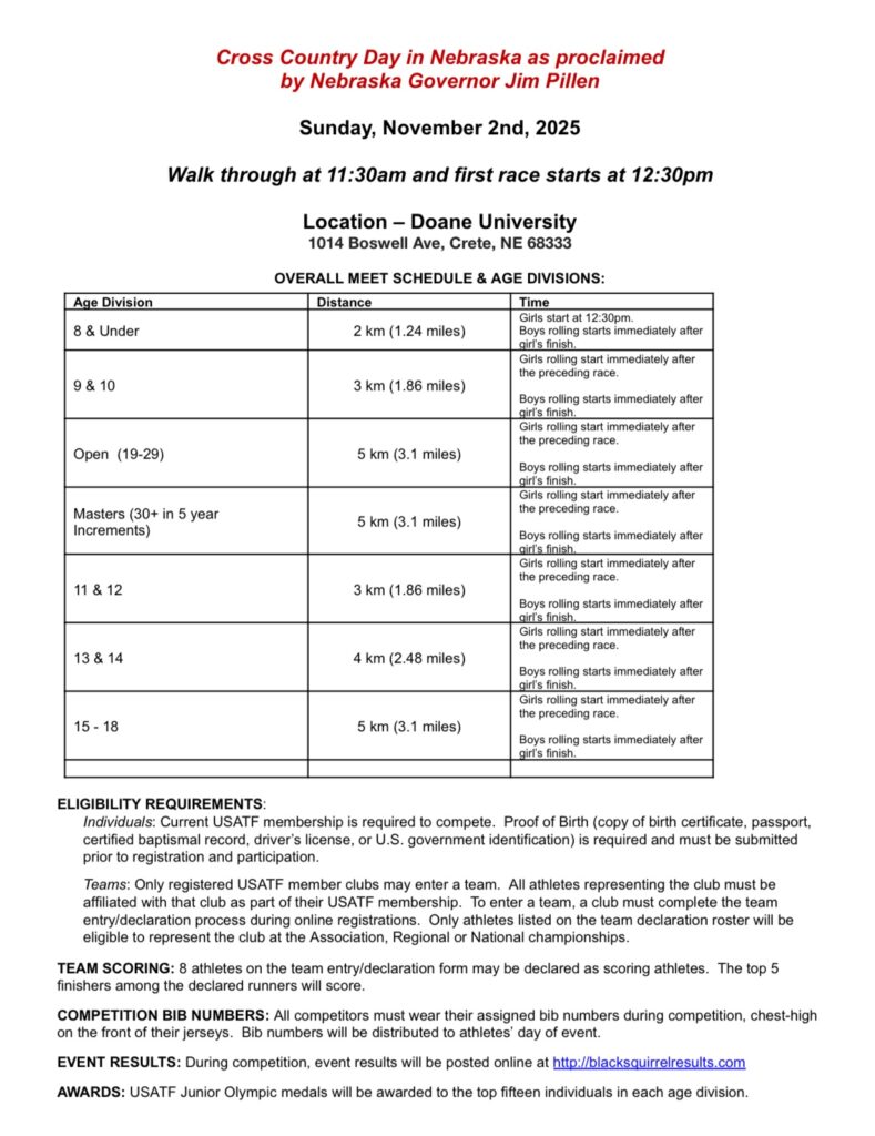 This event will also serve as the 2025 USATF Nebraska, Nebraska Open and Masters Cross Country Championships.
